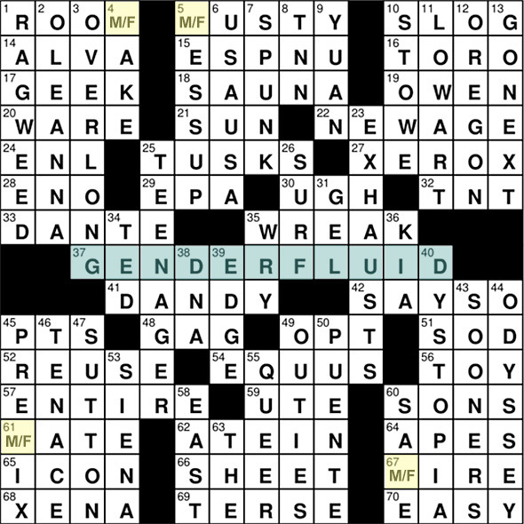 It’s the theme of Tausig’s puzzle, though, that makes it special. Four entries in Thursday’s crossword can include either an “F” or an “M.” Both are correct; neither is wrong. For example, “Part of a house” can be either ROOF or ROOM. The long “revealer” answer, tying those select entries together and spanning 11 squares smack-dab in the middle of the puzzle, is GENDER FLUID.