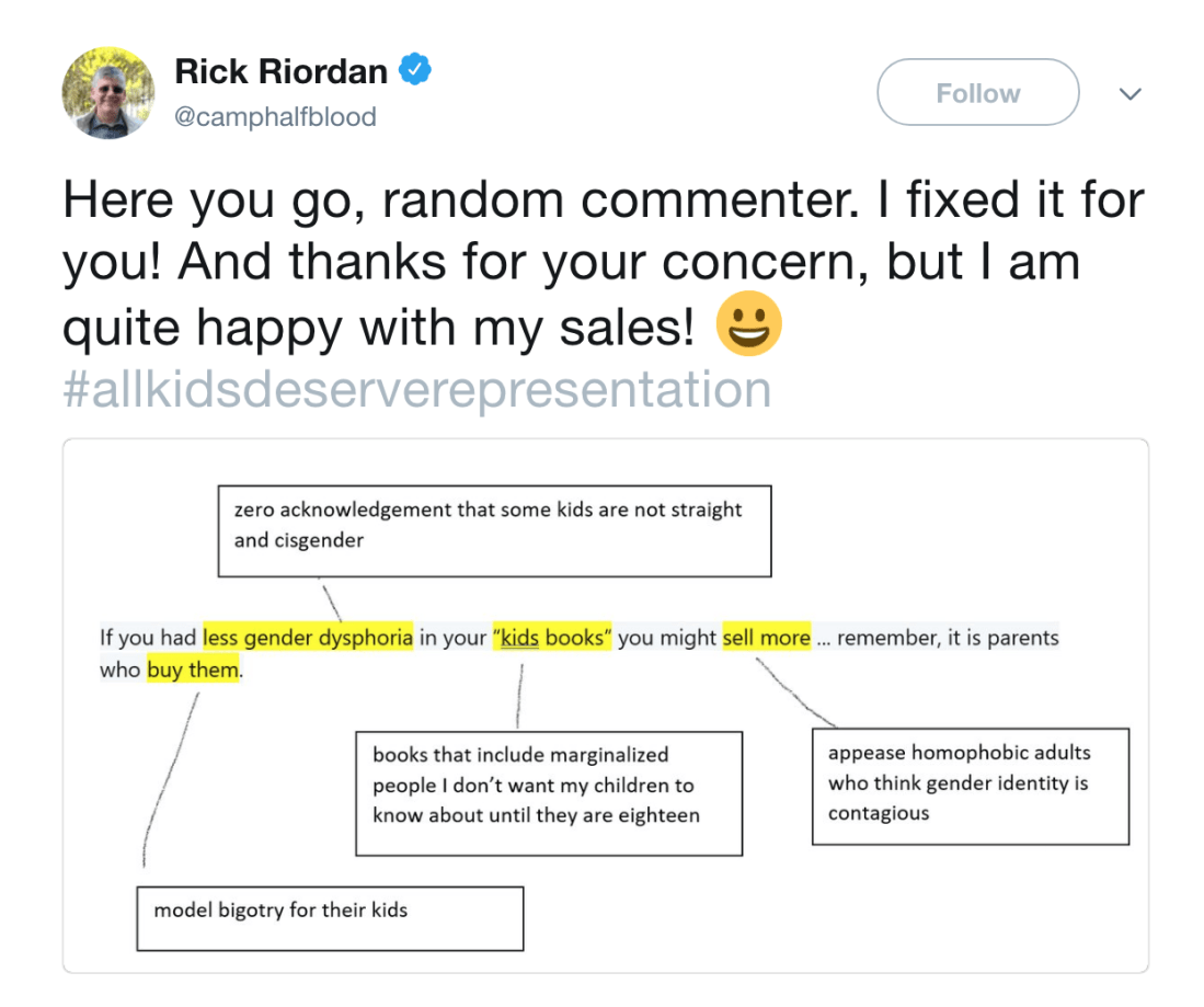Rick Riordan’s “vanilla YA fantasy” series was written for his son with ADHD and dyslexia because there weren’t any books about kids with learning disorders. He “made his bones” on representation, you just didn’t notice because disabled people don’t count.